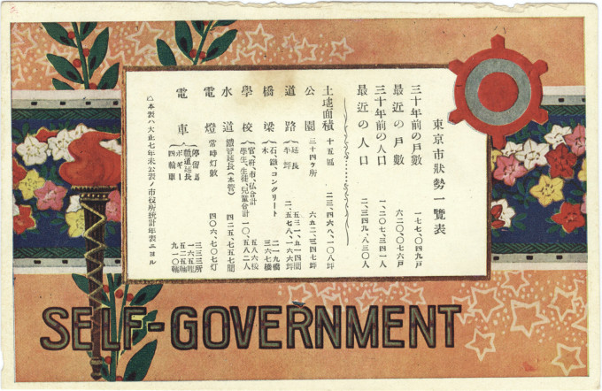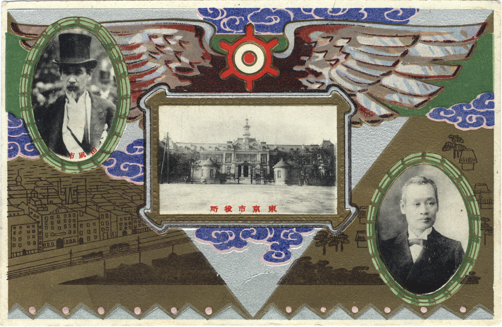 Commemorative postcard, Tokyo self-government 30th anniversary, 1919. Tokyo City’s first mayor, Matsuda Hideo, is shown in the upper-left photo inset.