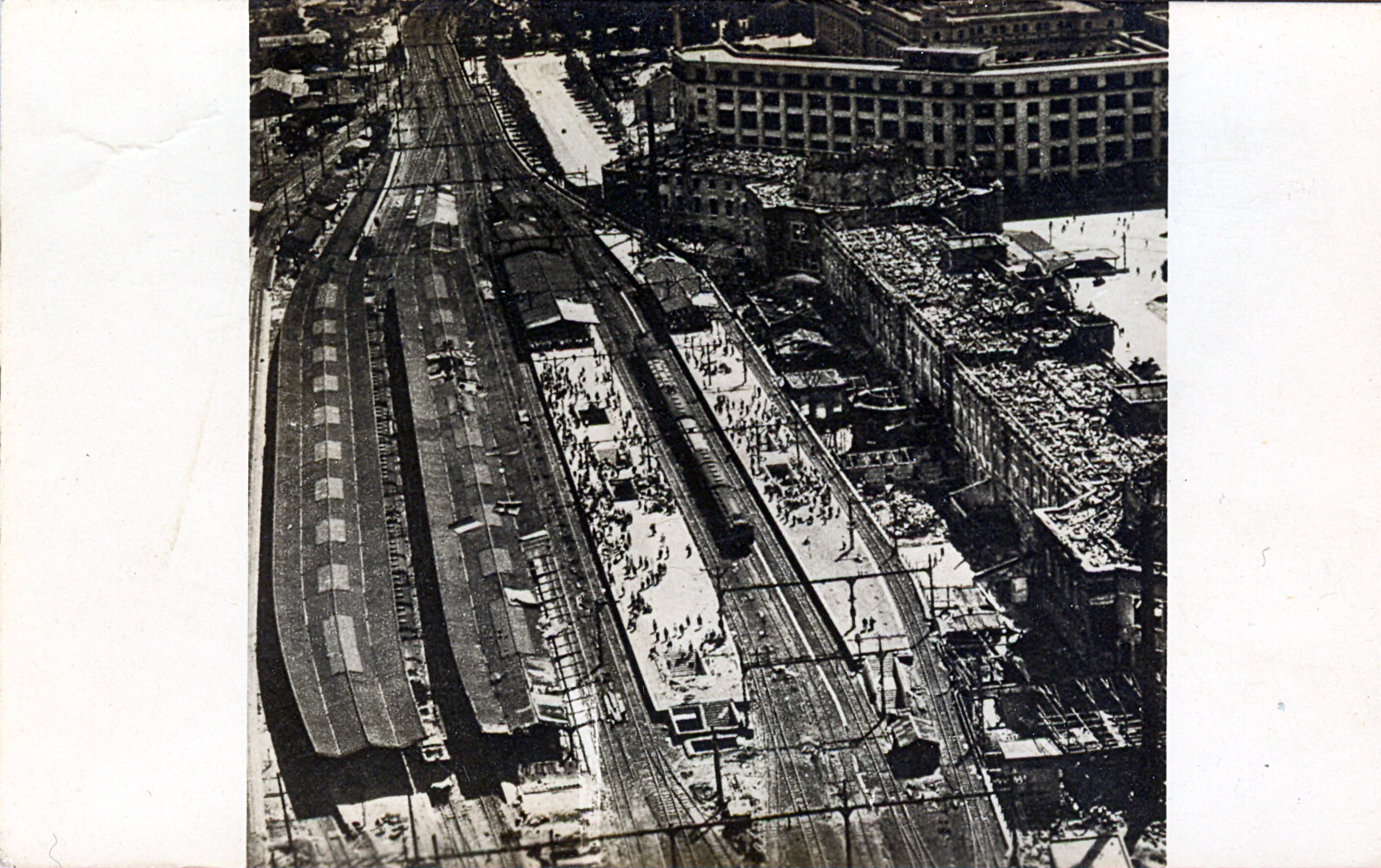 Aerial view of Tokyo Station, 1945. The entire third level of the terminal was destroyed in the May, 1945 firebombing of the capital.