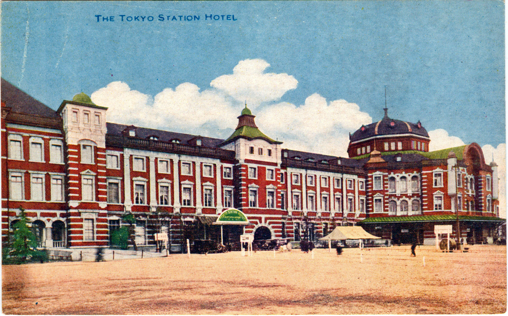 A green awning locates the entrance to the Tokyo Station Hotel, c. 1920. To its left you can see, roped off, the Emperor’s personal entrance to the terminal.