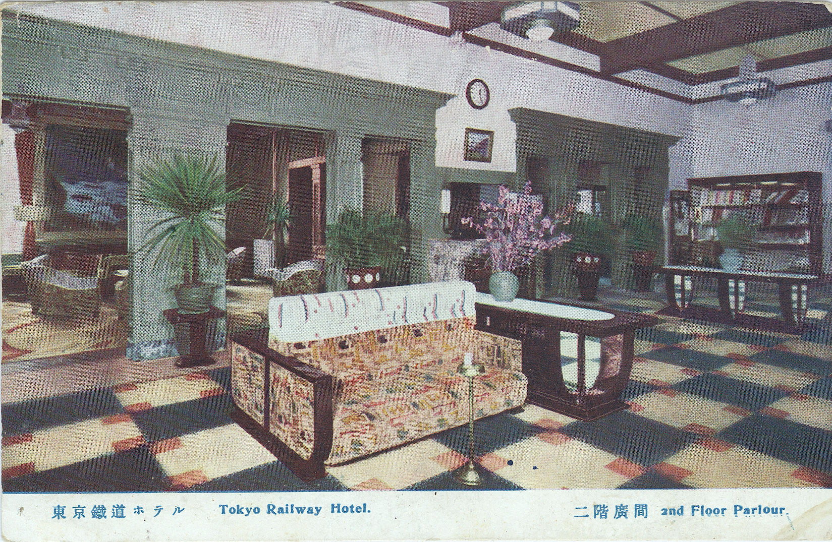 Second-floor parlour (lobby), Tokyo Railway Hotel, Tokyo, c. 1940, renamed after its management had been shifted to the Ministry of Railways in the early 1930s from the privately-owned Tokyo Station Hotel.