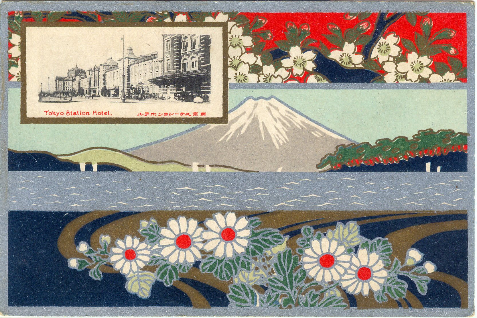 Tokyo Station Hotel is inset over a Mt. Fuji, sakura and chrysanthemum motif, c. 1925.