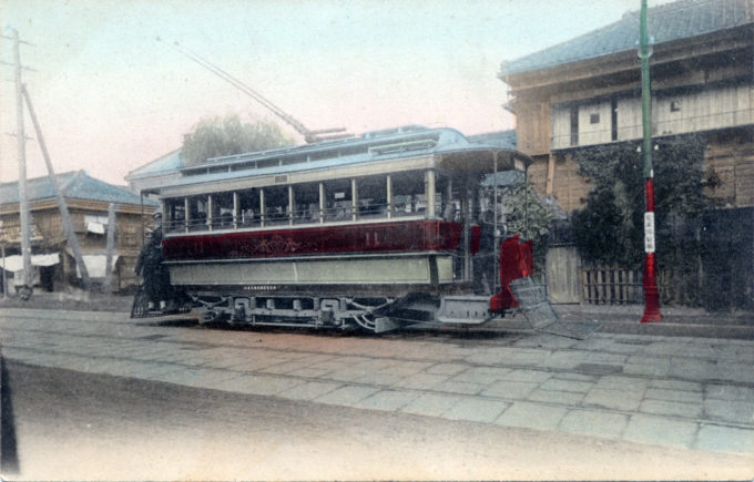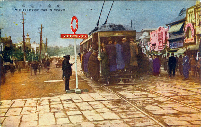Electric streetcar glides across Shimbashi, c. 1905. Route #1, from Shinagawa-to-Ueno via Shimbashi & Ginza, was the first streetcar route to be completely electrified.