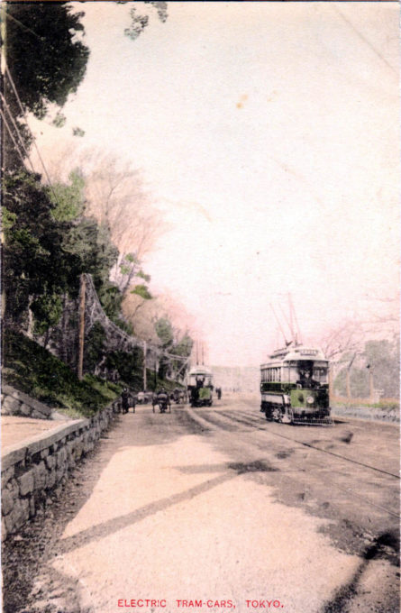 “… [T]hree streetcar companies – Tokyo densha tetsudo, Tokyo shigai tetsudo (nicknamed ‘Gaitetsu’), and Tokyo denki tetsudo (better known as the Sotobori line) – provided a network of trams that wove through the center of Tokyo. Each company’s streetcars were painted a different color … For example, Gaitetsu cars, which served areas as far west as Shinjuku, were green … The Sotobori streetcars had large glass-plate windows, luxuries many people had not seen before.