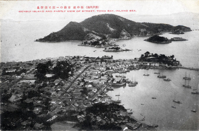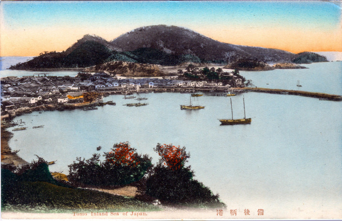 “Tomo, Inland Sea of Japan,” c. 1910. Tomonoura’s unique circular harbor has been preserved even after more modern port facilities have been built since 1868. But, a 1983 plan to build a bridge across the port area – that would have obliterated Tomonoura’s fabled view – was turned back by popular local opposition and an international outcry.