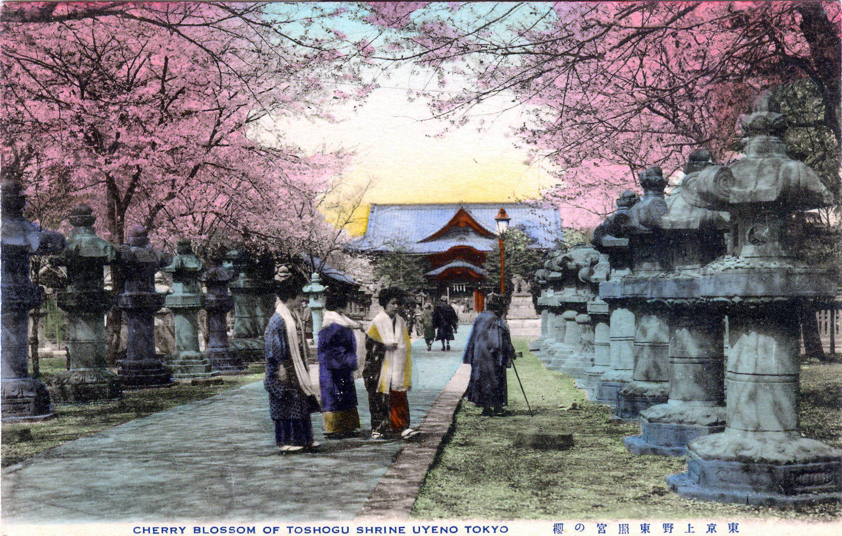 “Cherry blossom of Toshogu Shrine,” Ueno, Tokyo, c. 1920. Toshogu Shrine was built and dedicated in 1627 to the memory of Tokugawa Ieyasu (1542 – 1616), the founder of the Tokugawa Shogunate. The building is trimmed in gold leaf and contain intricate wood carvings, and is considered to be great example of Shinto architecture in the Edo period. The shrine emerged unscathed from the Battle of Ueno in 1867 (the last stand of the Tokugawa shogunate), the 1923 Great Kanto earthquake, and (rather miraculously) the 1945 wartime firebombings of Tokyo. Several of the structures on the shrine grounds, including the main shrine, have since been designated Important Cultural Properties.