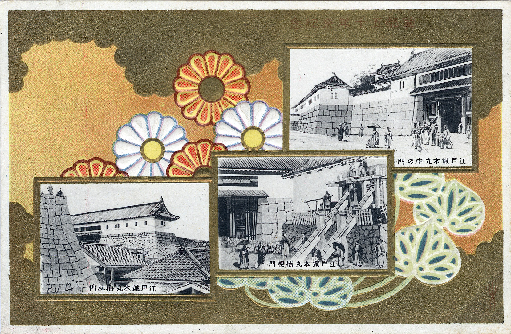 Edo Castle Inner Citadel. Left-to-right: Bairin-mon (Bairin gate), entrance to the tea ceremony house; Kikyo-mon (Kikyo gate), named after the bellflower (kikyō), which was derived from a family crest seen during the construction of the Edo Castle; Inner gate, entrance to the castle’s innermost sanctum, Honmaru. From a postcard series commemorating the 50th Anniversary transfer of the nation’s capital from Kyoto to Tokyo, 1919.