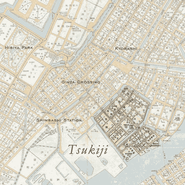 “Tsukiji (‘filled-in ground’), the one-time Foreign Concession, occupies a strip of land facing the bay at the S. edge of the city in Kyobashi-ku, and with its several museums, the big Seiyoken Hotel, etc., contains consider able of interest.
