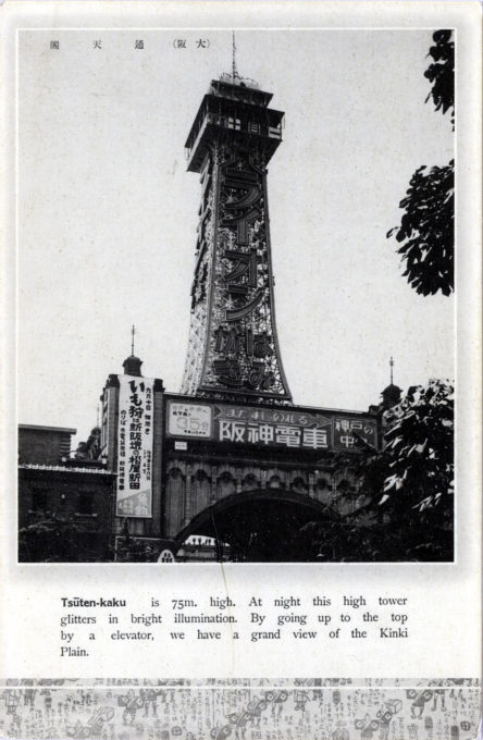 Tsutenkaku Tower, Osaka, c. 1940. “At night this high tower glitters in bright illumination. By going up to the top in a elevator, we gave a grand view of the Kinki Plain.”