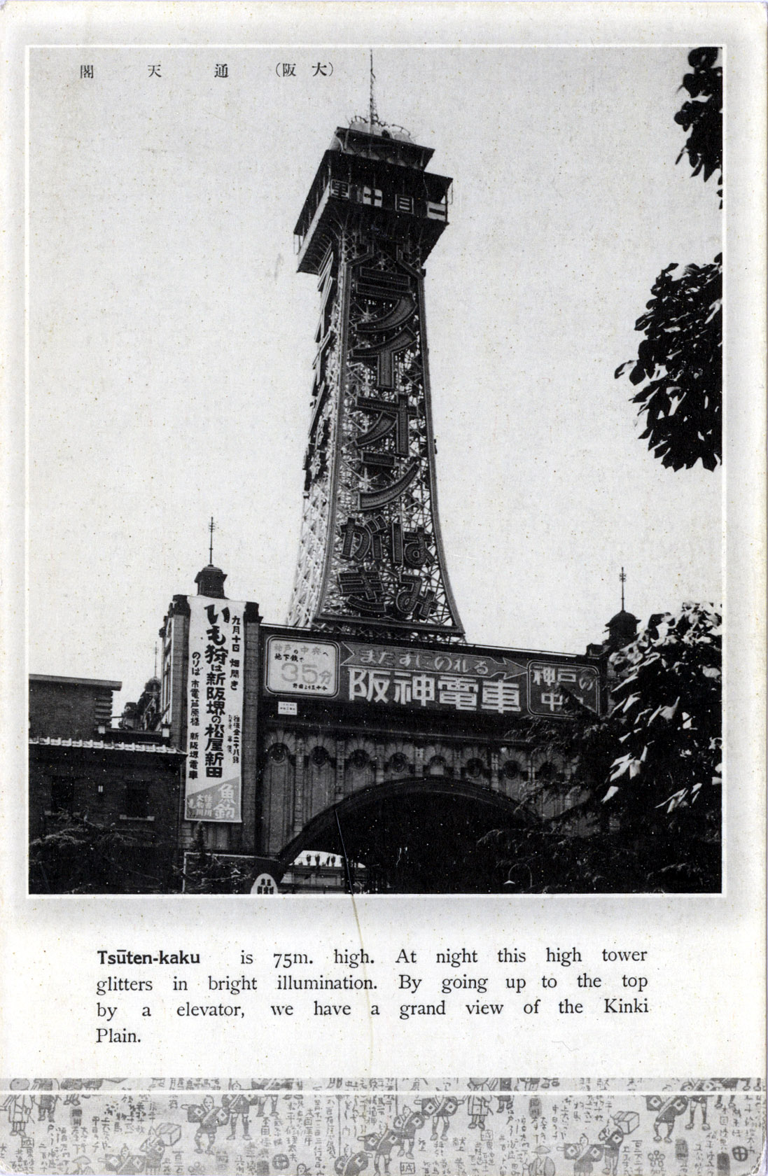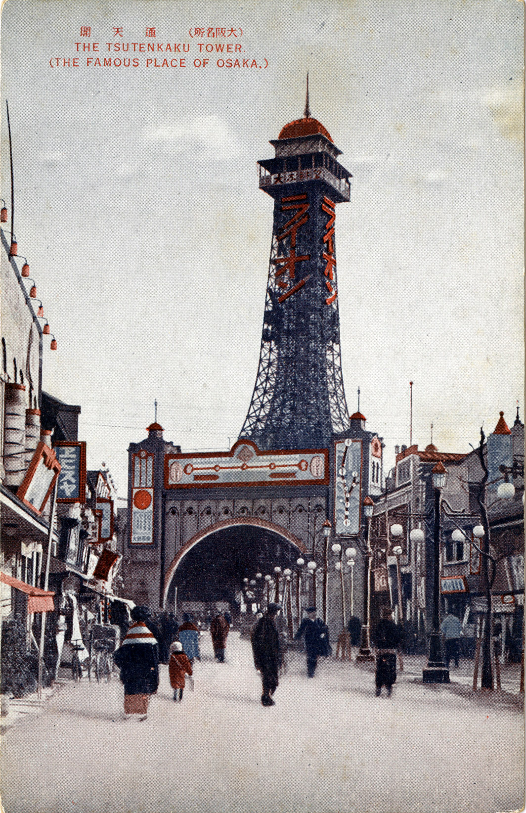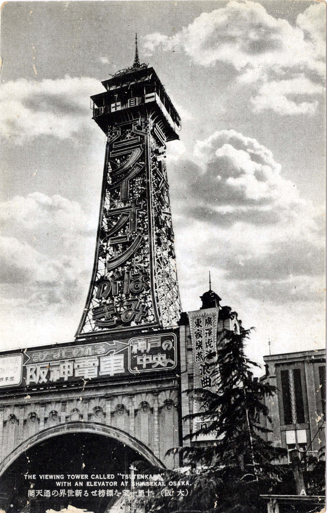 “The viewing tower called ‘Tsutenkaku,’ with an elevator at Shinsekai.” Tsutenkaku Tower, Osaka, c. 1930.