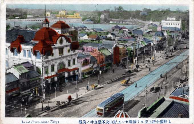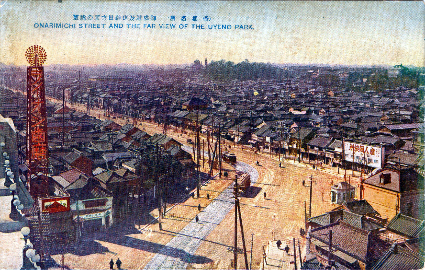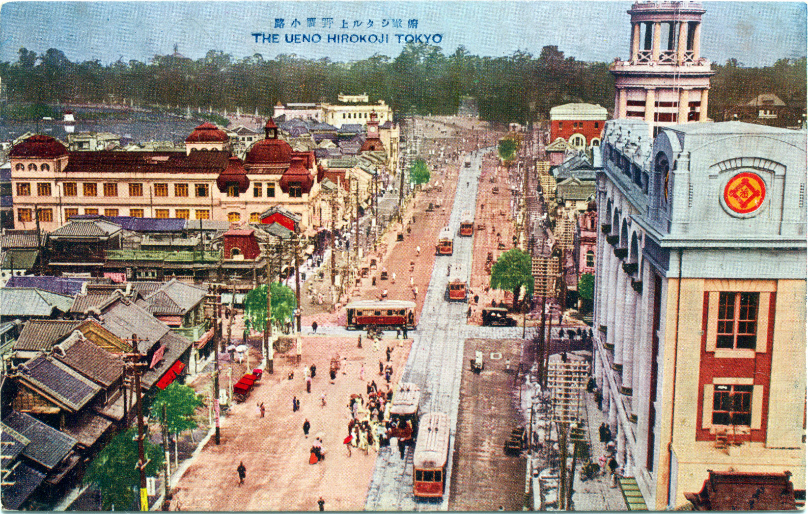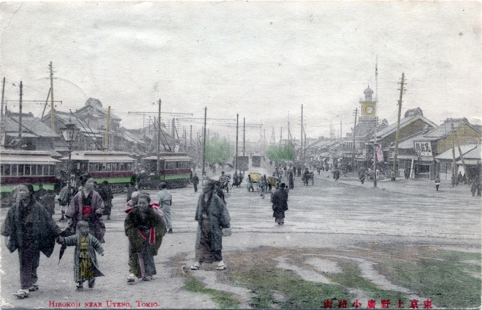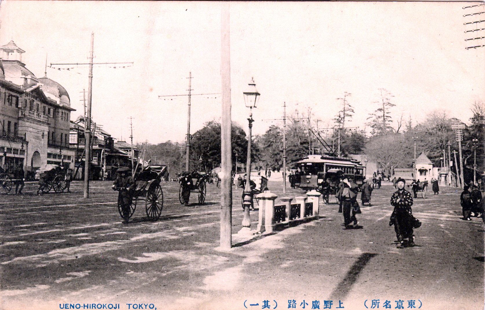 Horse-drawn trolley service began in the mid-1870s, running down Hirokoji from Ueno south to the Shimbashi railway terminal and east from Ueno to the temple district at Asakusa. The first electrified streetcars were routed along the same courses through Hirokoji in 1903.
