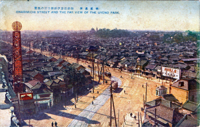 Ueno Hirokoji (Broadway), Tokyo, c. 1910. The tower of the Matsuzakaya department store can be seen left of center; to the right is the Ueno Suzumoto [traditional Japanese comedies] theater, Tokyo’s oldest entertainment hall. In the far distance is a tower advertising “Lion”-brand tooth powder (see postcard below).