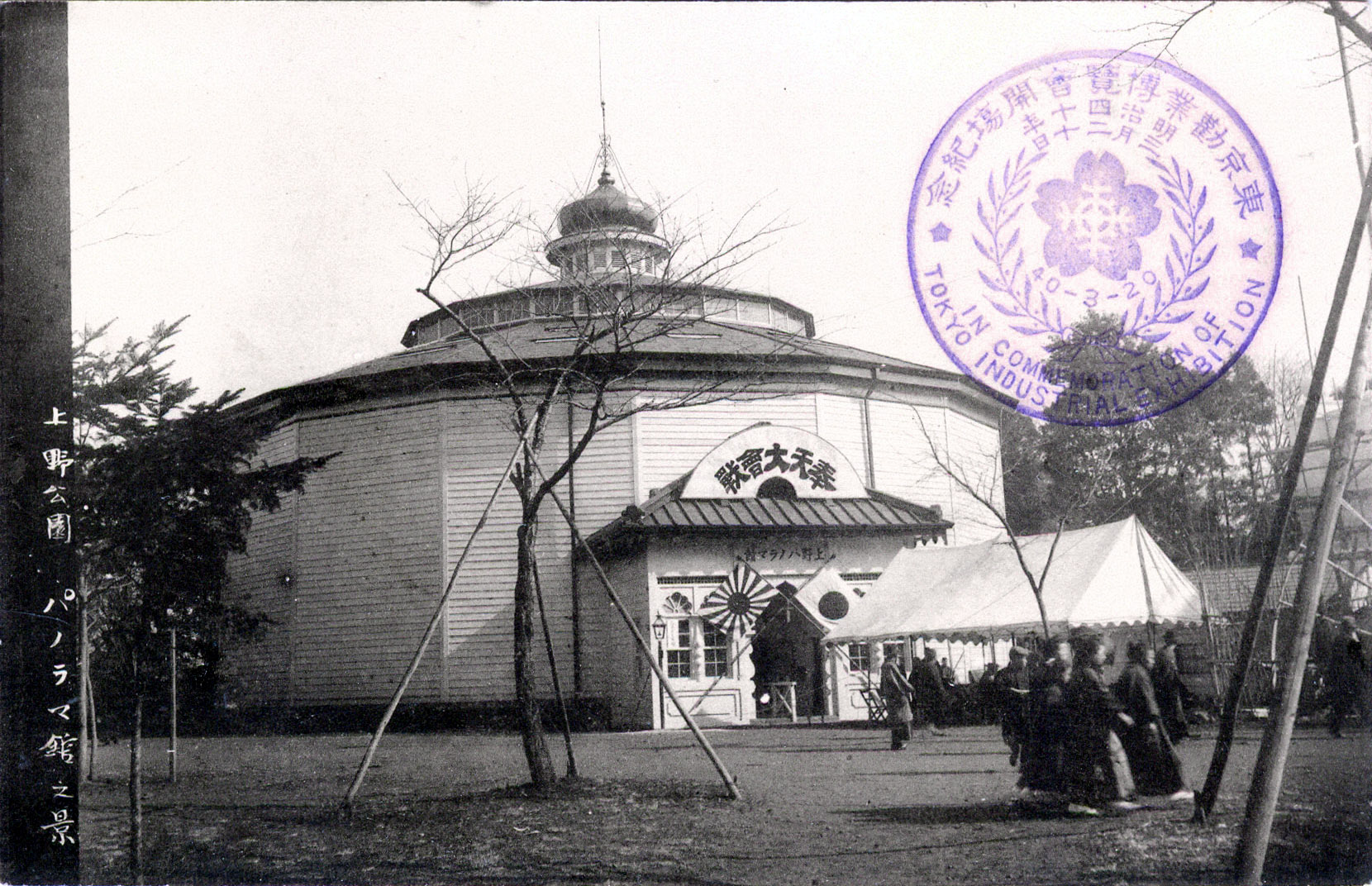 Panorama-kan, first opened at Ueno Park in 1890, was still in operation during the run of the Meiji Industrial Exhibition as seen in this 1907 exhibition commemorative postcard.