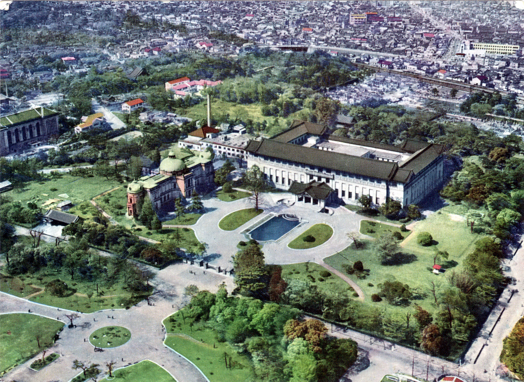 Aerial view of museums, Ueno Park, Tokyo, c. 1960. At center are the Hyokeikan (center-left) and Hakubutsukan (center-right), rebuilt in an “Eastern emperor’s crown” style after the 1923 Great Kanto earthquake. At far-left is the Tokyo Academy of Music.