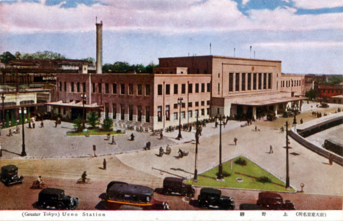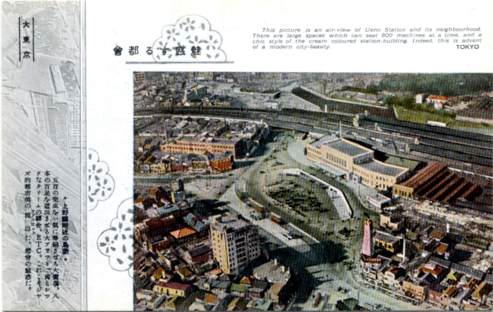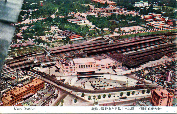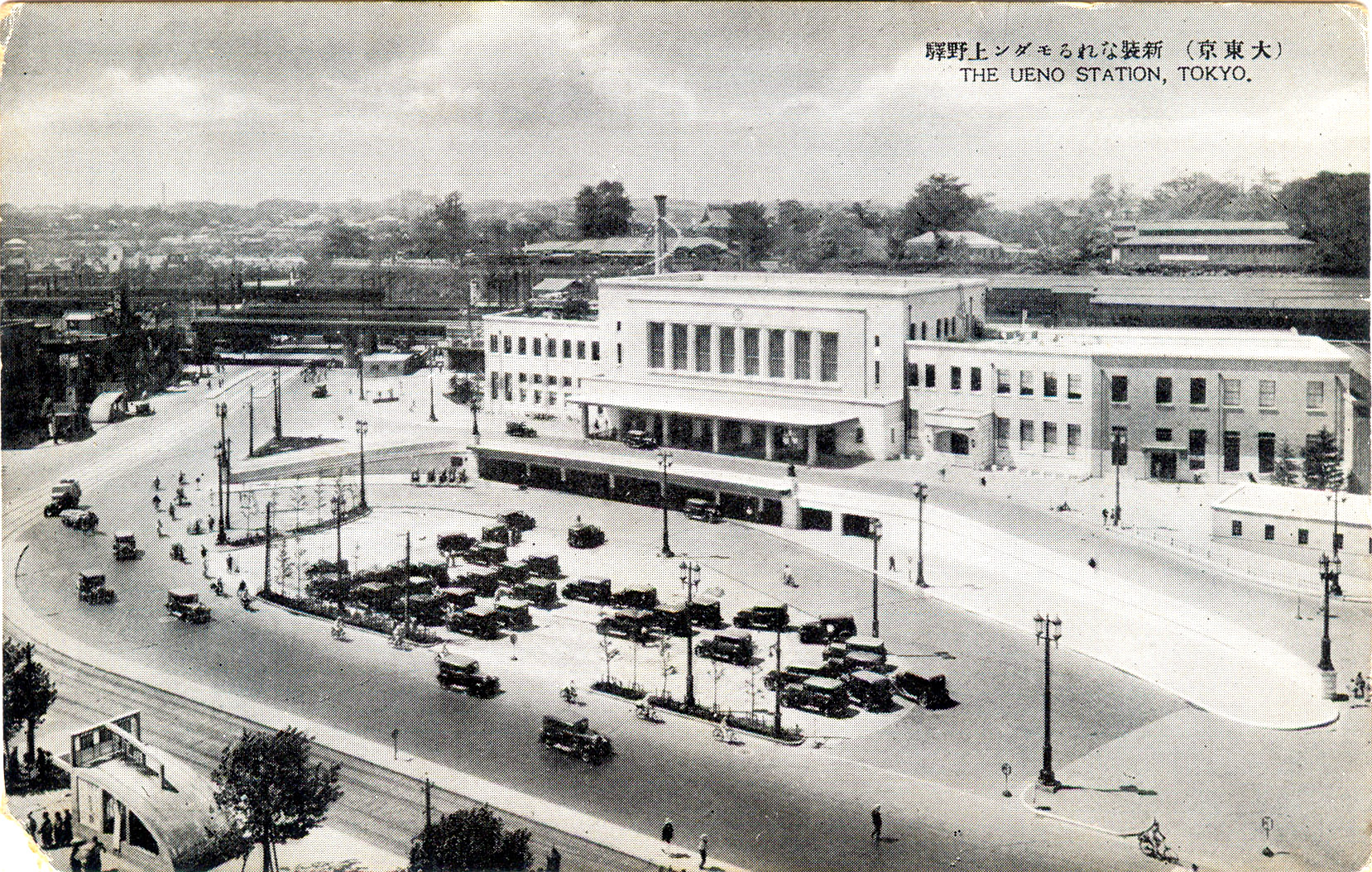 Ueno Station, c. 1930, with Ueno Park in the distance. Lower-left is a subway entrance leading to the Ginza Line, Tokyo’s first subway, completed in 1927.