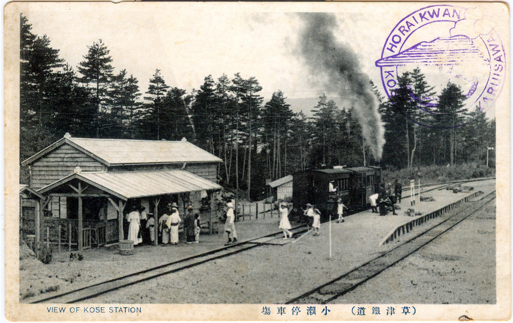 View of Kose Station, c. 1920, with a commemorative stamp from Horaikwan, a local hot springs ryokan (inn). A short ride from Karuizawa Station on a now-defunct local rail spur, the Kusatsu Railway, would bring a visitor to Kose Station and the onsen [hot baths] for which the tiny hamlet was famous in the fold of the hills beneath Mt. Atago, a half-mile beyond the Mikasa Inn.