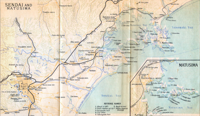Map of Matsushima “Inland Sea” (upper right) and islands relative to Sendai along the Pacific coast of Tohoku. (Japan: The Official Guide, 1941)