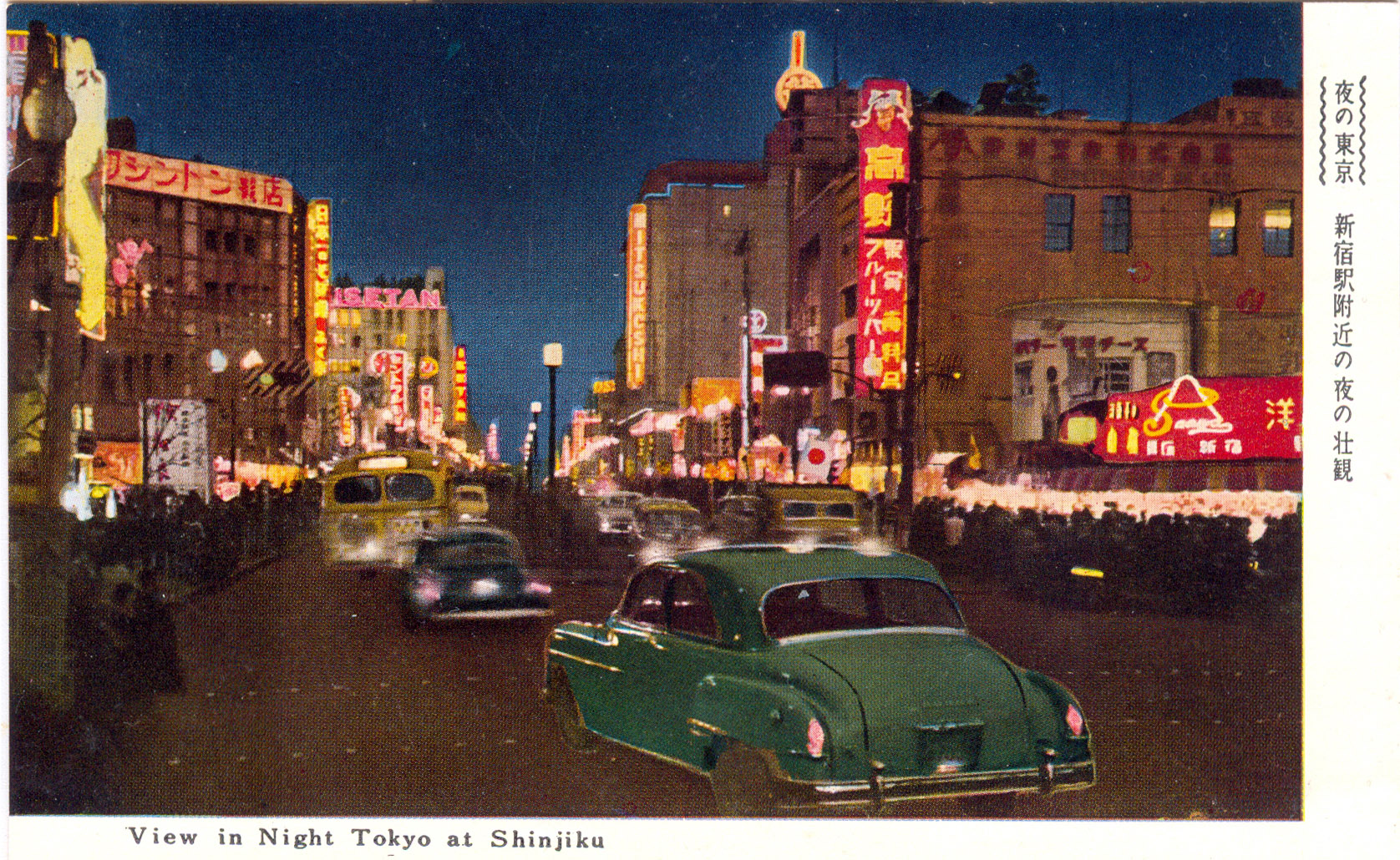 “Shinjuku in 1960 was thronged with sidewalk shoeshine stands, city-operated streetcars on Toden Dori (now Yasukuni Dori), camera shops filled with bargain hunters, cinemas surrounding the Kabukicho peace park, commuters switching trains in a tumbledown national railway station … To the youthful vanguard in 1960, Shinjuku meant cheap rent, plays and concerts in Kinokuniya Hall, a first-rate bookstore, a handful of galleries sponsoring contemporary art, and tales from an older generation about pre-war salon culture in Nakamuraya, a bakery and cafe long since out of favor with the young.