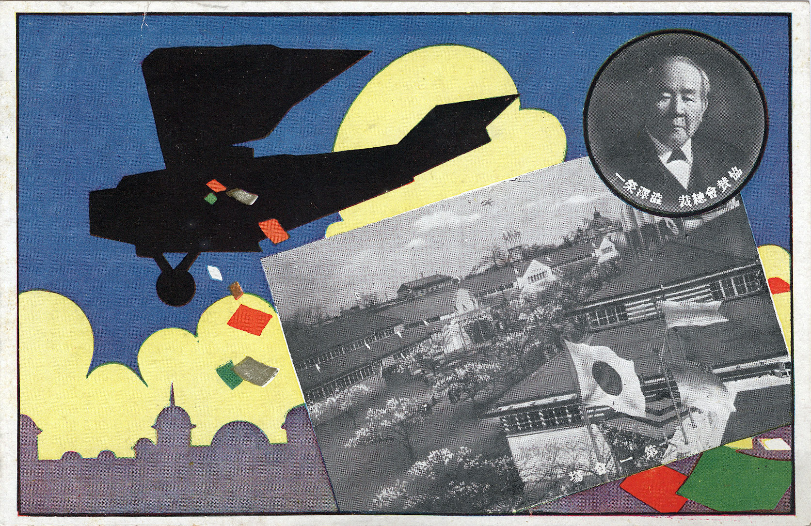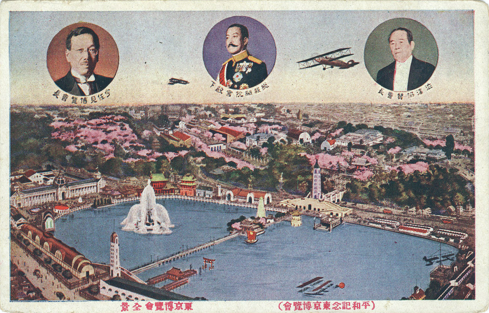 Aerial view of the Peace Commemorative Exposition, Uneo Park, Tokyo, 1922. Inset photos left-right: Exhibition President K. Usami; Honorary President Prince Kan-in; Viscount Shibusawa (“father of Japanese capitalism”).
