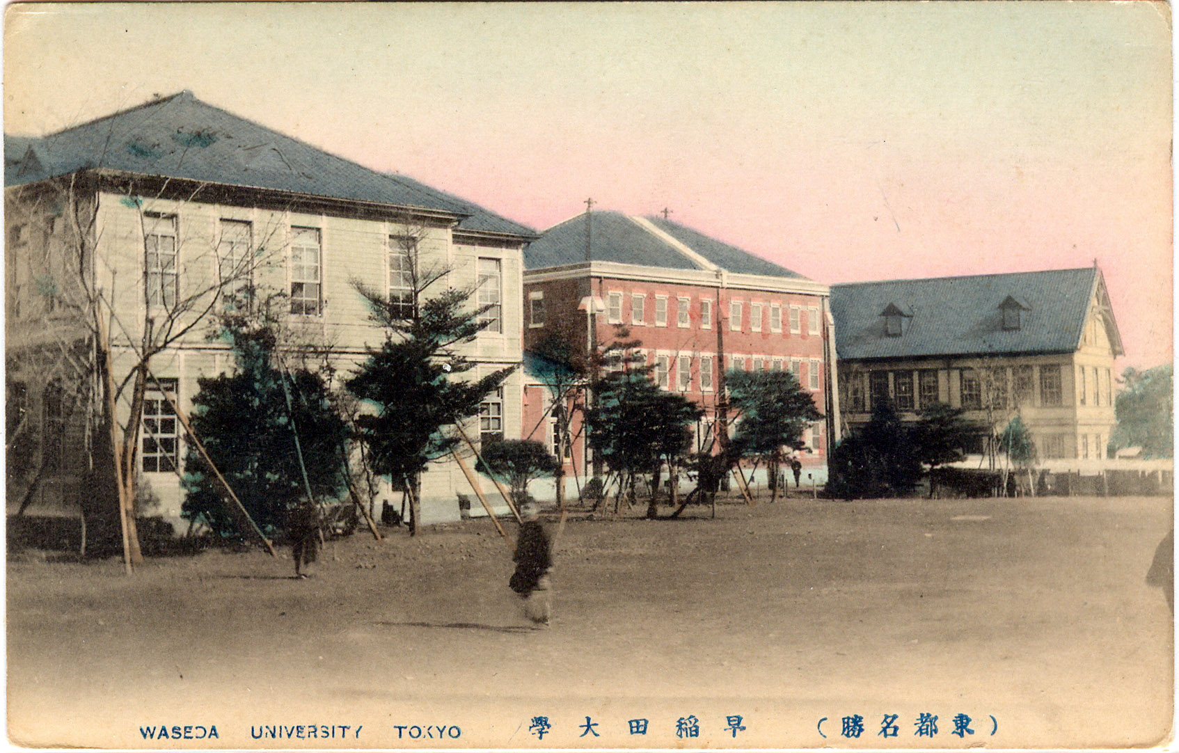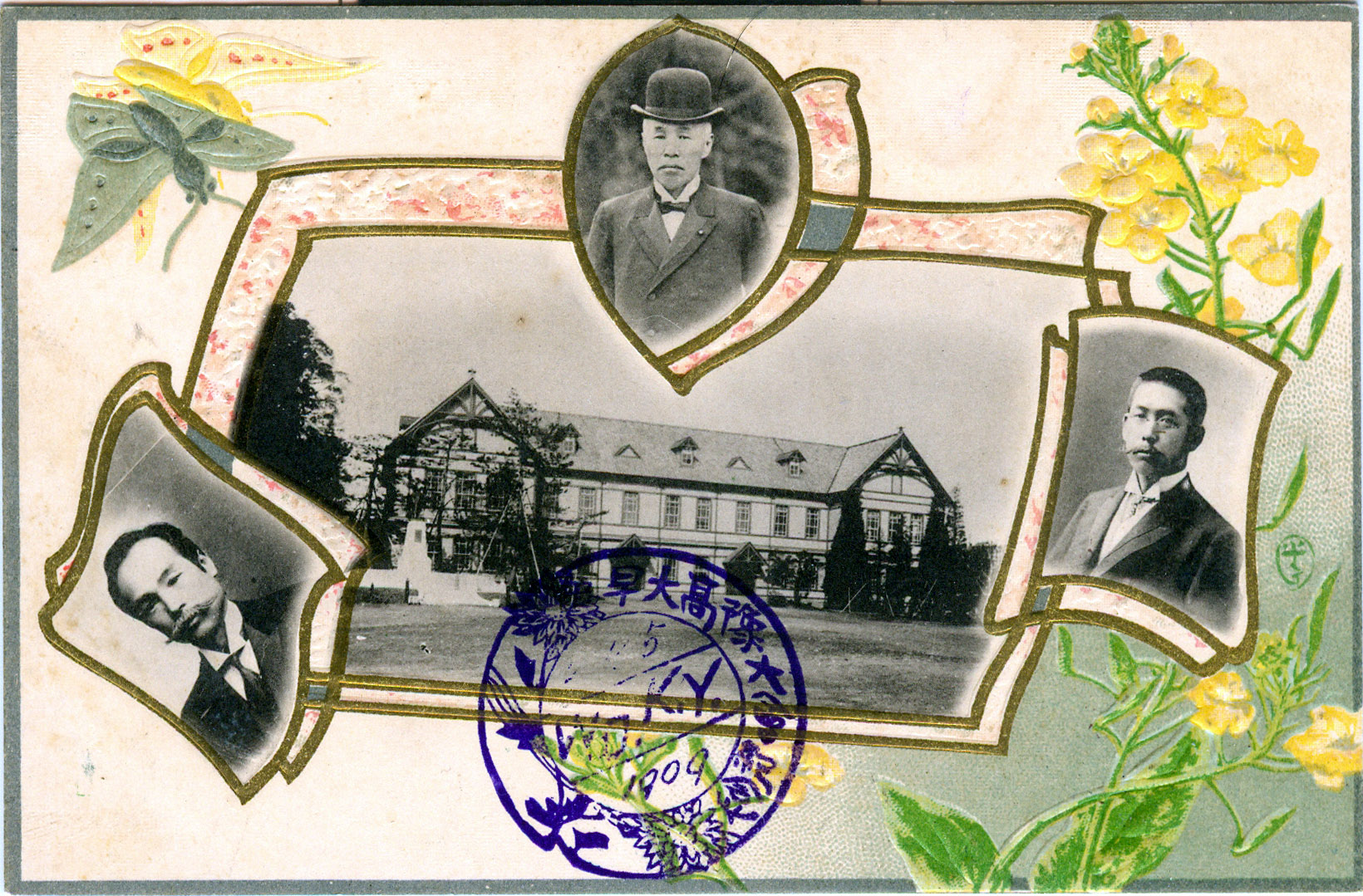 The founder of Waseda University, Ōkuma Shigenobu, is pictured at the top of this 1909 commemorative postcard, depicting the university’s administration building.