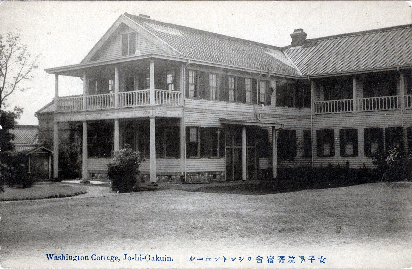 “Washington Cottage, Joshi-Gakuin”, Tokyo, c. 1910. The Graham Seminary (1873) and the Sakurai Jo Gakko (1878) were merged in 1889 to form Joshi Gakuin, a Presbyterian mission school for girls in Tokyo established by Julia D. Carrothers.