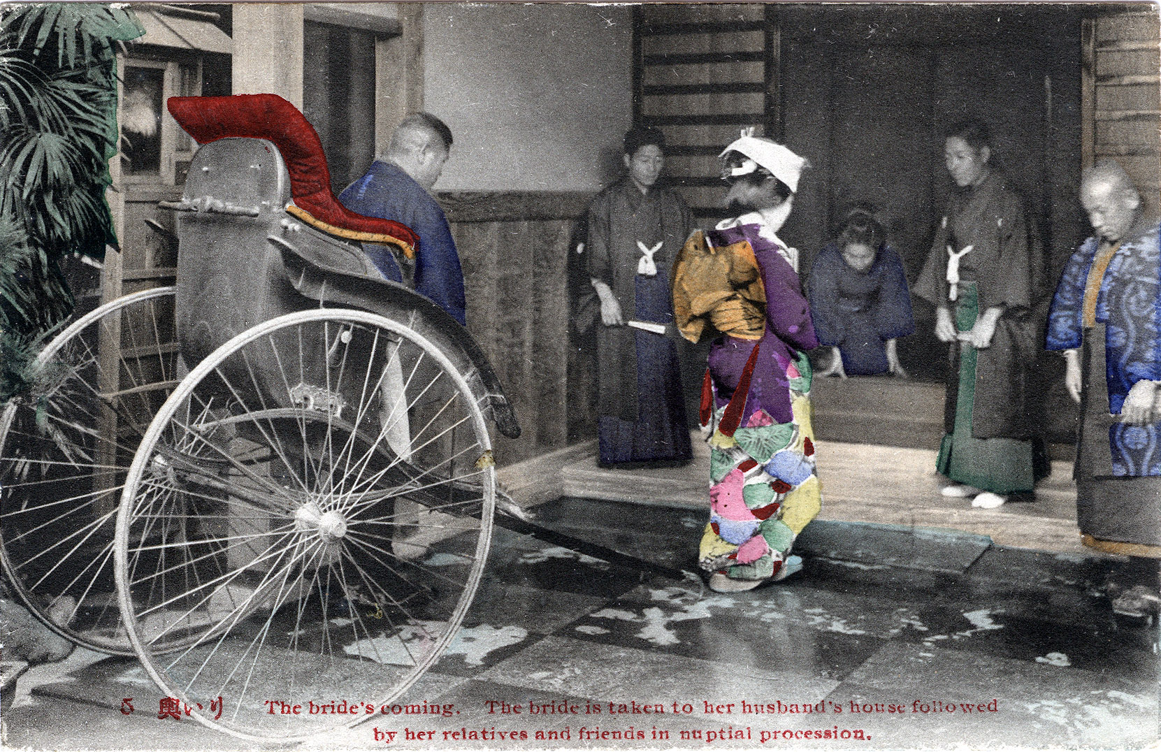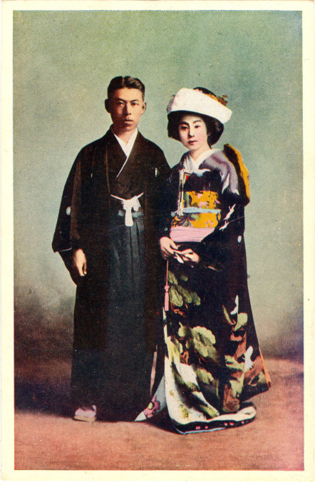 “… On the wedding day the bride, accompanied by her go-between and his wife, arrives at the bridegroom’s house with a present for the bridegroom. The bride, with her hair dressed in the style of bunkin-takashimada, generally wears three long-sleeved kimono, worn one over the other, the outer being of black crépe-silk with designs of flowers and birds of auspicious significance, and the inner two of pure white silk.
