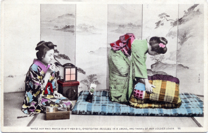 “While her maid makes ready her bed, O-Koto-tan [sic] indulges in a smoke, and thinks of her soldier lover.” #11 in a series of “A Day in the Life of O-Koto-san” postcards published during the Russo-Japanese War (1904-1905). This might be one of the bawdiest of the series.