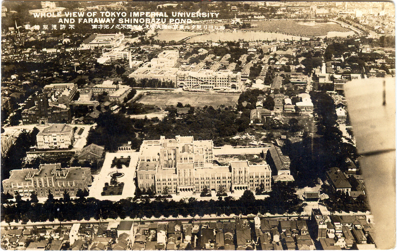 “Whole View of Tokyo Imperial University and Faraway Shinobazu Pond”, Tokyo, c. 1930. Akamon (Red Gate) can be seen at lower-right, after its relocation in the 1920s.