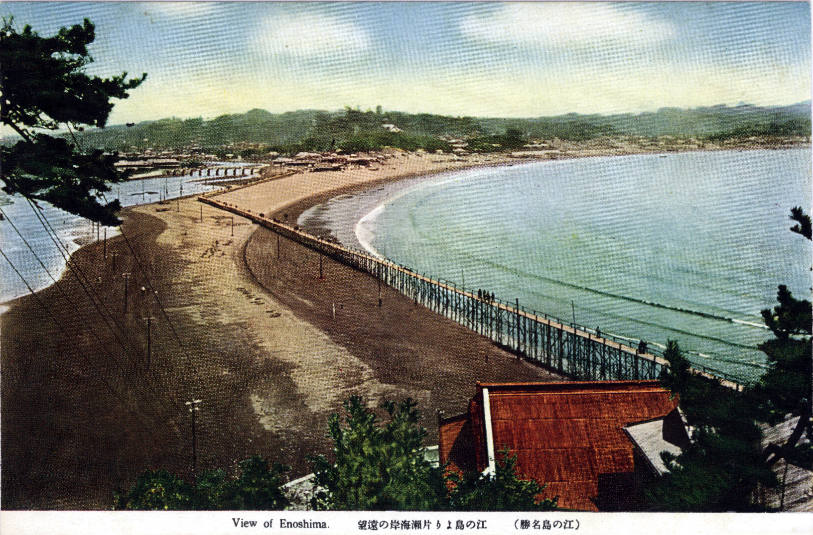 “Most people know of Kamakura and spend at least a day there , but I had never realized that Enoshima was but a short half hour away by trolley line from the station where one gets out to visit the great Shrine of Hachiman and the famous Daibutsu … As the tram rounded a curve I , who was standing hanging on to a strap of the much over-crowded car, was shoved forward so that I looked out of the window towards the West.