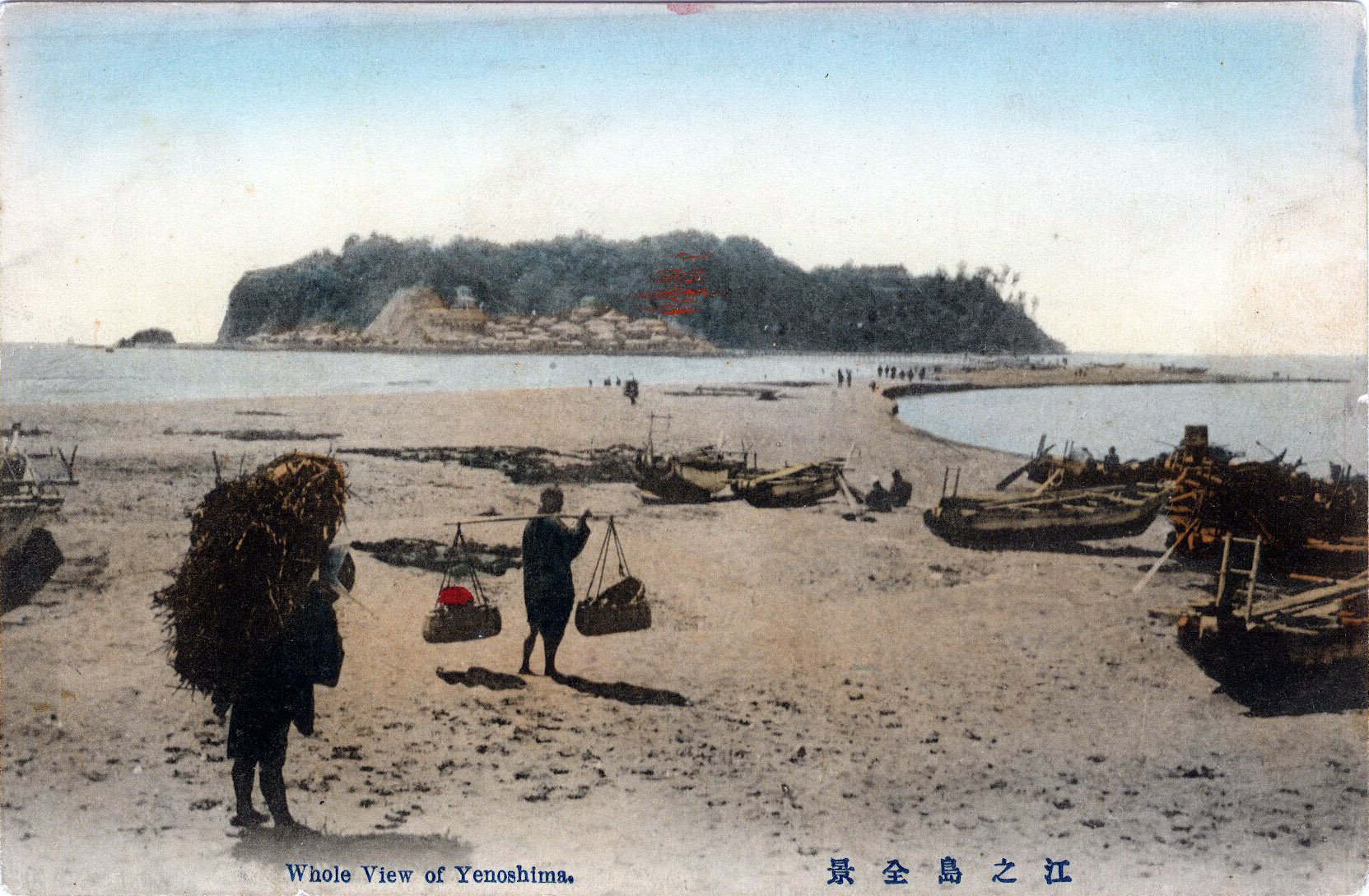 “Whole view of Yenoshima”, c. 1910. Before a causeway bridge was constructed, a visit to Enoshima could be made only at low tide.