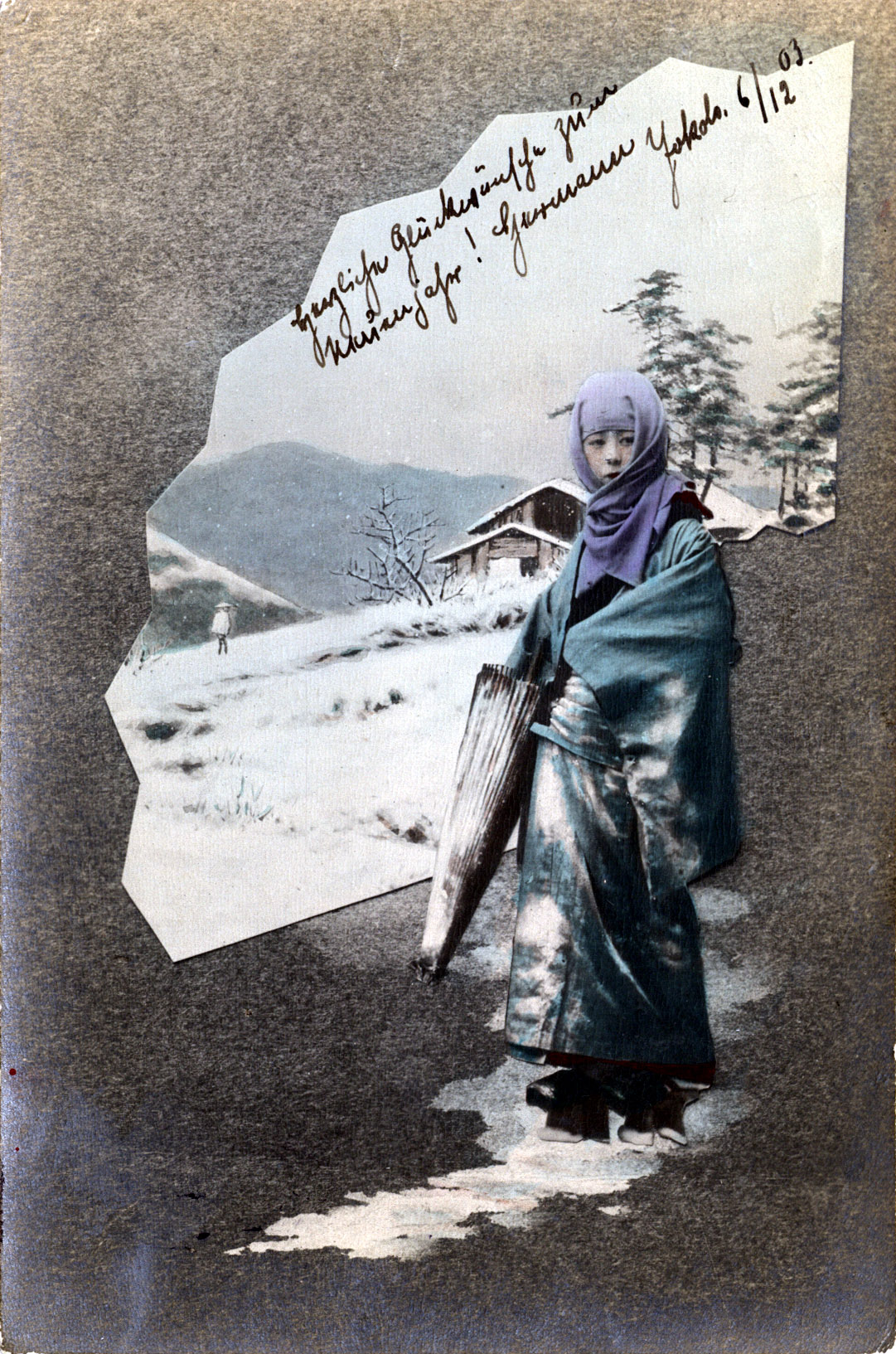 Winter scene, 1903. A young woman dressed with heavy winter kimono and head scarf, wearing geta, tracking through a snowy mountain village.