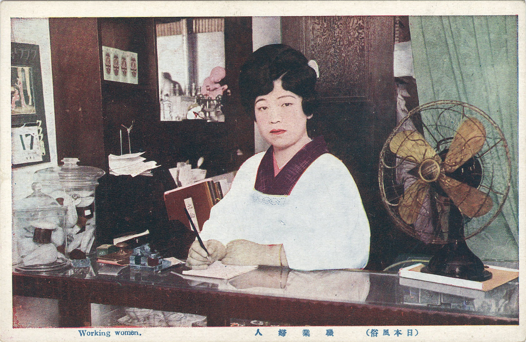 “Working women”, c. 1920, in a storefront retail setting – very likely in a street shop adjoining the family domicile. The Japanese caption (職業婦人) roughly translates to “career woman”.