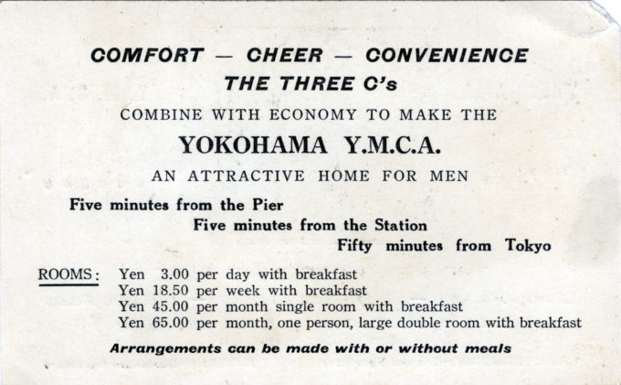 “Yokohama YMCA, centered on Yokohama Seaside Church, opened on October 18, 1884 (Meiji 17), 40 years after the birth of YMCA movement in London. Activities centered on young people spread from the coastal church to the finger-road church; many young people also gathered together the Bible study group, English study group, lecture meeting, music concert, etc., which opened the door to general citizens.”