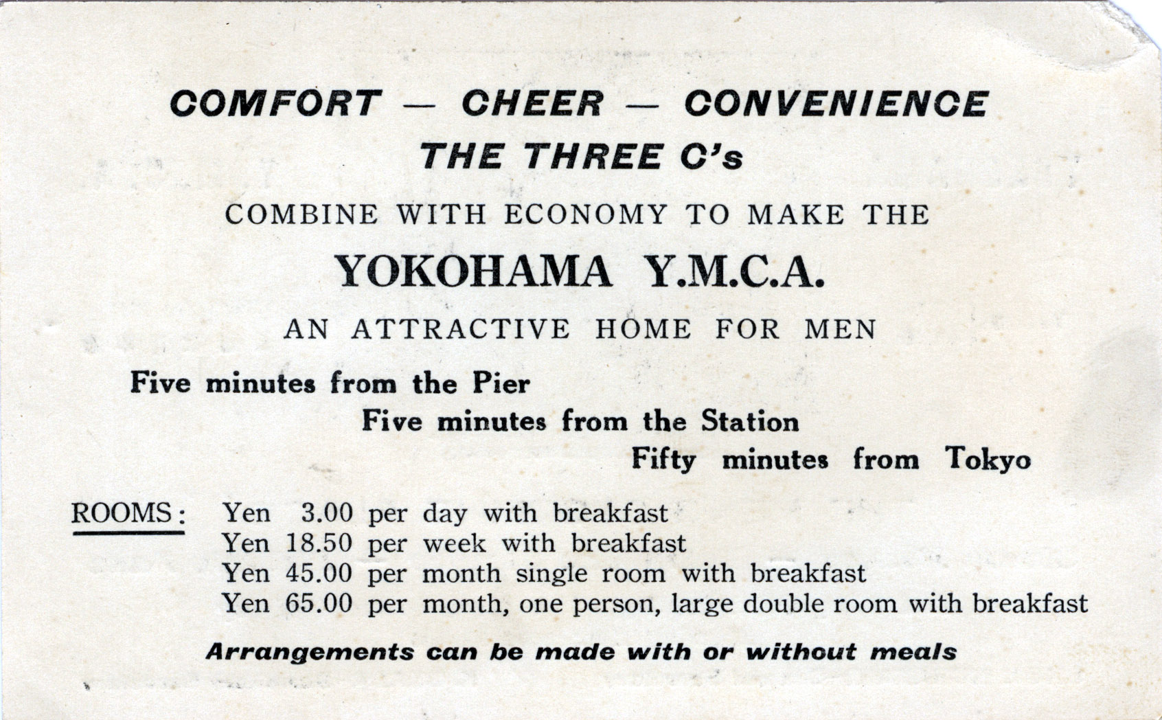 “Governor Ariyoshi of Kanagawa, at the laying of the corner stone of the new building of the Yokohama YMCA, said that wherever there is a YMCA – whether in schools or in cities but especially in the first- it is proving a wholesome agency for the upbuilding of character.