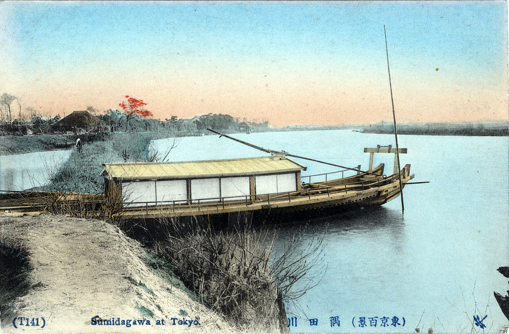 “Sumidagawa at Tokyo”, c. 1910. Yanebune [lit. roofed boat] enjoyed their greatest popularity during the Edo era (1603-1868) but continued to ply the waters on the Sumida River into the 20th century. Yanebune were sometimes also called chochin-bune [lit. lantern boat].