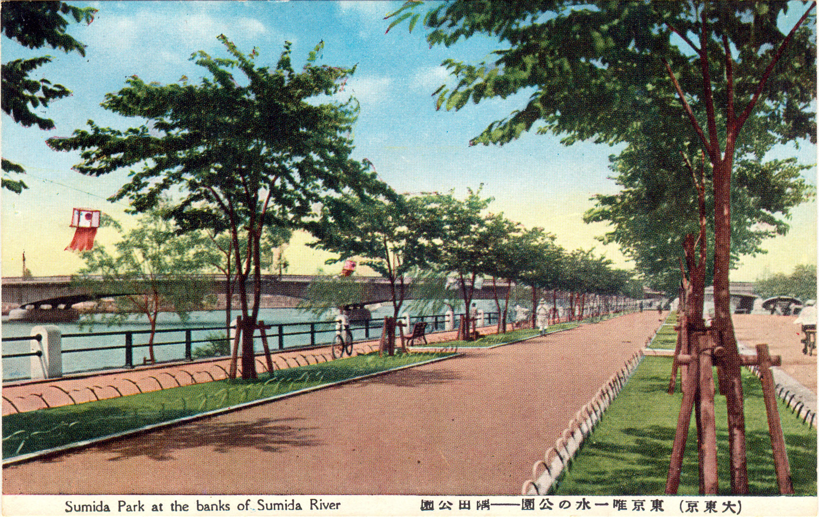 “Sumida Park made its debut as a mile-long promenade along both sides of the river, with an innovative Western design that restored the lyrical Sumida landscape. In order to create just the right modern vista, the venerable Yaomatsu restaurant was torn down.”