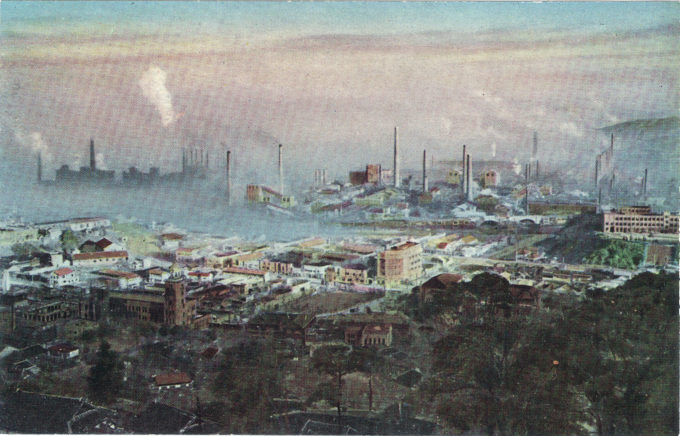 Yawata Iron and Steel Company, Yawata, Kyushu, c. 1940. Back-caption: “Yawata Iron and Steel Company at Yawata, the largest of its kind in the Orient, is the prize of industrial Kyushu.”