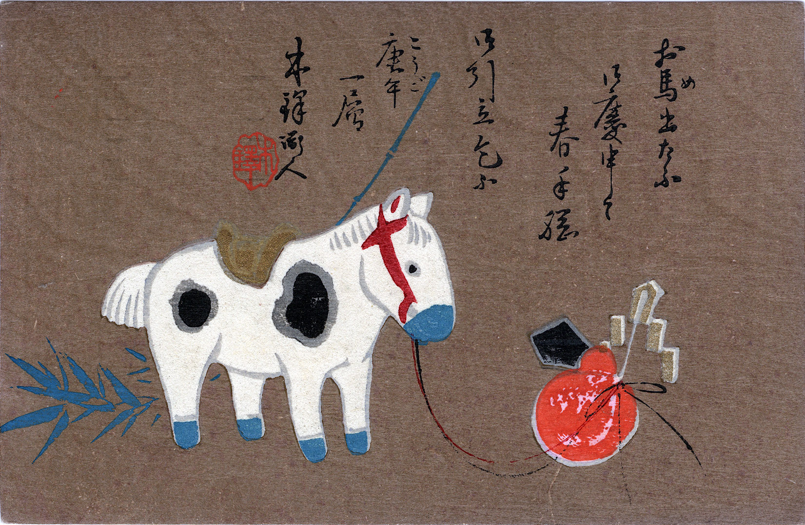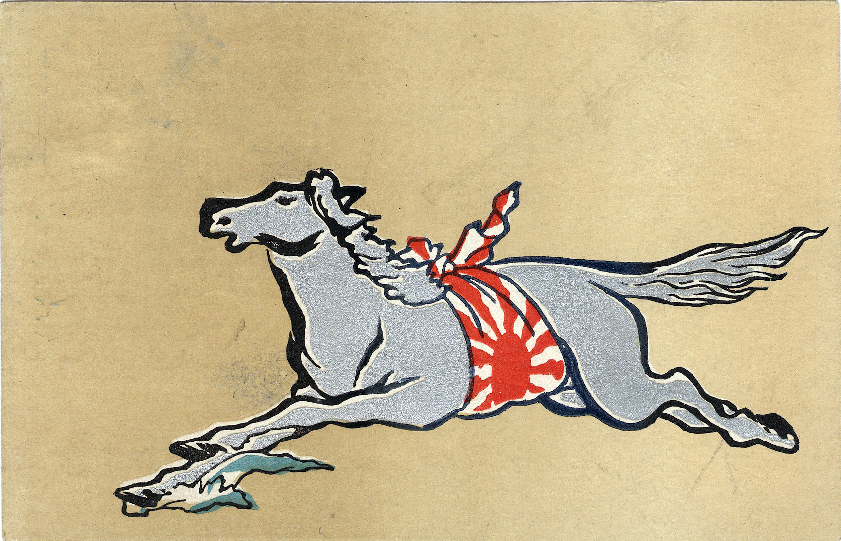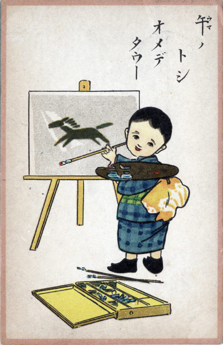 “Year of the Horse”, New Years postcard, 1906, an auspicious year for the zodiac sign because 1906 was only one of two “Fire Horse” (Hinoeuma) years to occur in the 20th century. The year 2026 will be the first “Fire Horse” year of the 21st century. (See below.) Due to a superstition birthrates in Japan tend to see a sharp decline each “fire horse” year.
