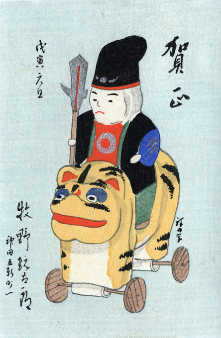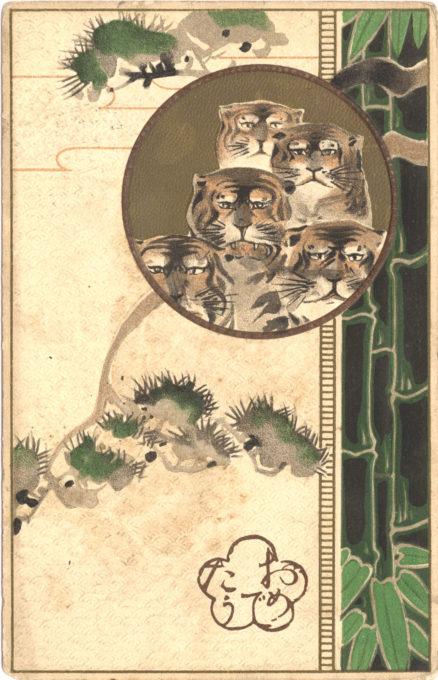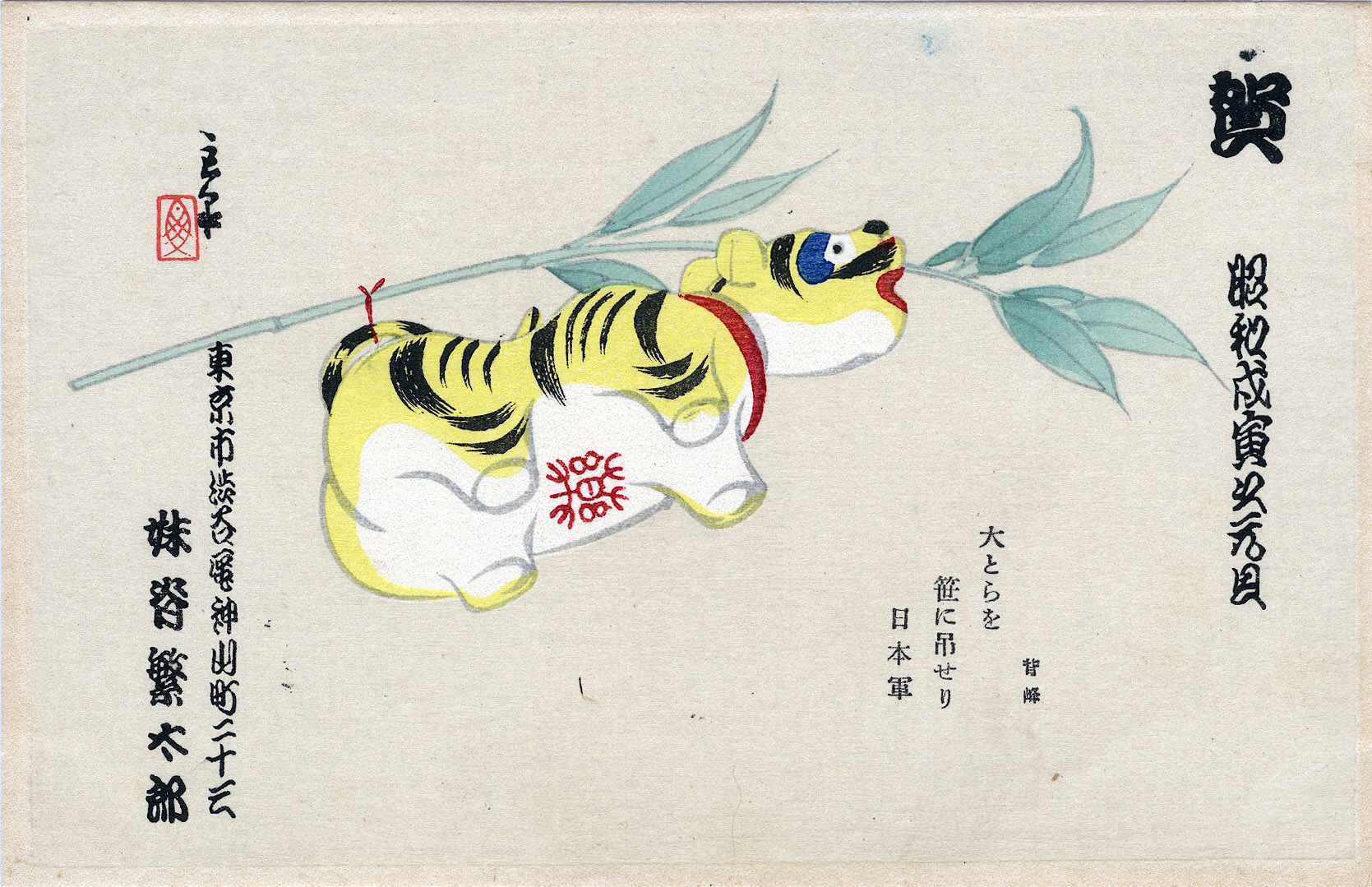 “Year of the Tiger”, New Year’s postcard, 1914, depicted in a traditional Chinese-brush style painting. Historically, feudal military leaders included the character for tiger in their names to such an extent that koga [虎牙, “tiger’s fang”] became synonymous with ‘general’ [shogun].