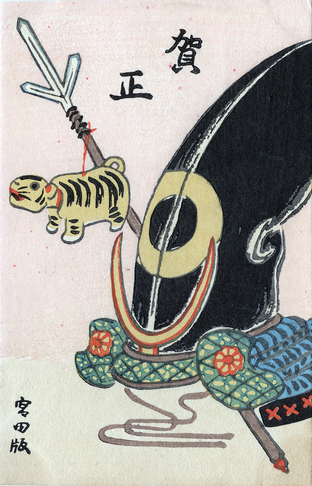 “Year of the Tiger”, New Year’s postcard, 1938. A bobble-headed hariko of a tiger (tora) dangles in front of a lacquered eboshi-nari kabuto (court cap-shaped helmet), formal samurai headgear since ancient times.