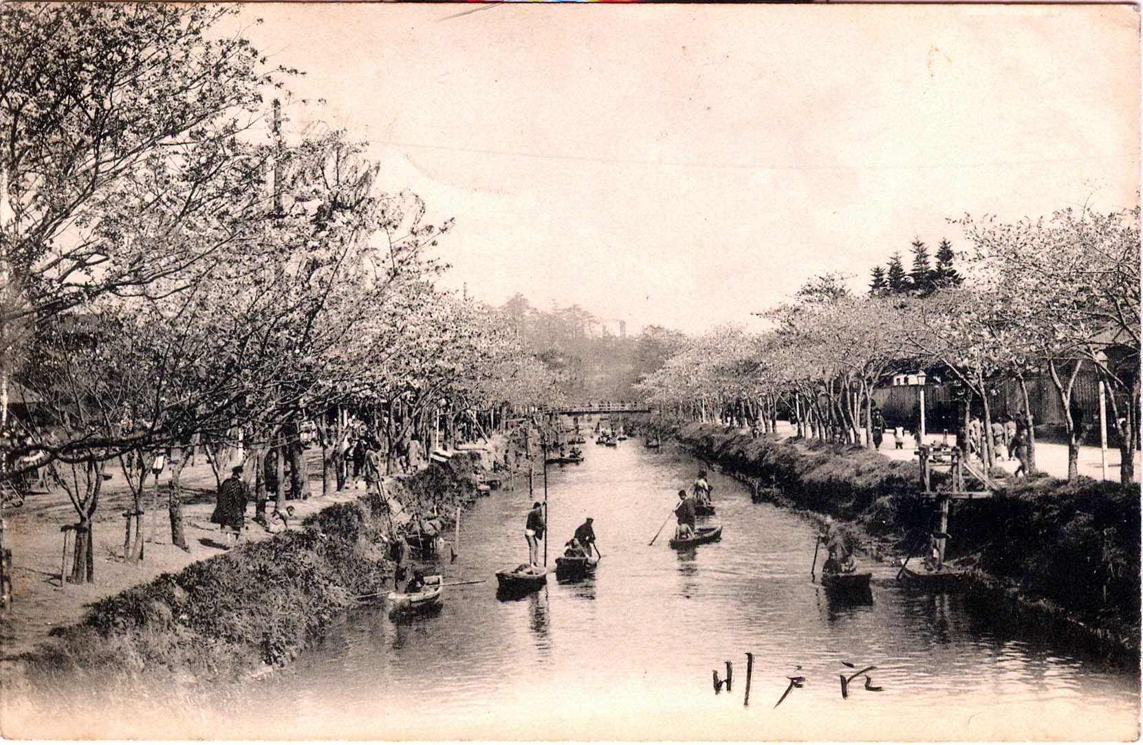 “The Edogawa, a canal in the Koshikawa quarter, near the arsenal, is a mile of double blossoms doubled in beauty by reflection, and boats up and down this lane of flowers as the most beautiful of all cherry-blossom effects.”