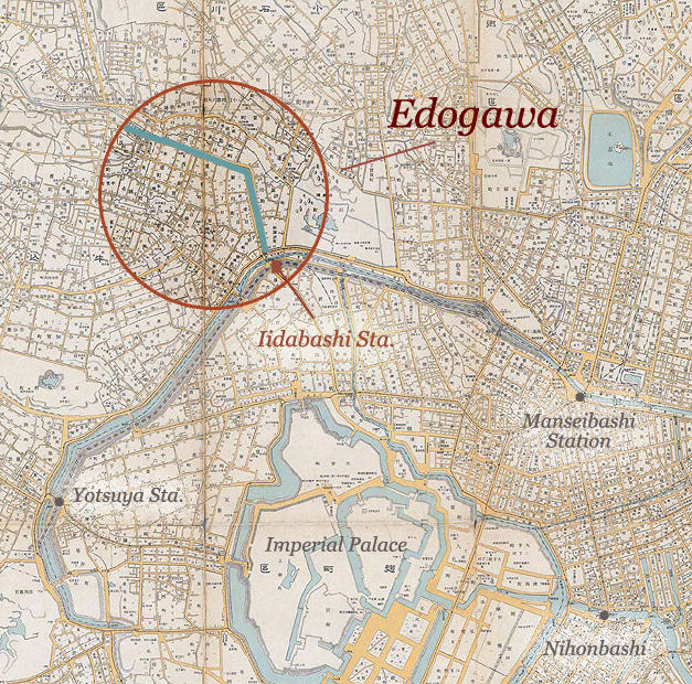 Other nearby place names derived from ‘Edogawa’ disappeared by 1966 but some remain, including Edogawa-bashi [Edo River bridge] and Edogawa Park. The canal has as its source two small lakes north of Ogikubo in suburban west Tokyo at Zenpukuji-koen [park] and Ichikishima shrine, and is named ‘Zenpukuji-gawa’ as the water winds its way east before being renamed ‘Kanda-gawa’ near Nakano, before entering the main stream of the Kanda River (canal) at Iidabashi.