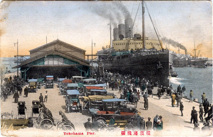 “The vessel now lets go her anchor outside of the [Yokohama] breakwater, while the Health Office Inspection is carried out, after which she proceeds within the harbour and berths alongside the pier, in the Customs Docks, or anchors some distance from the shore, in which latter case passengers and their baggage are conveyed to the Hatoba (Landing-stage) by steam-launches. On landing, passengers must attend to the Custom House examination of their baggage, before proceeding to their destination.
