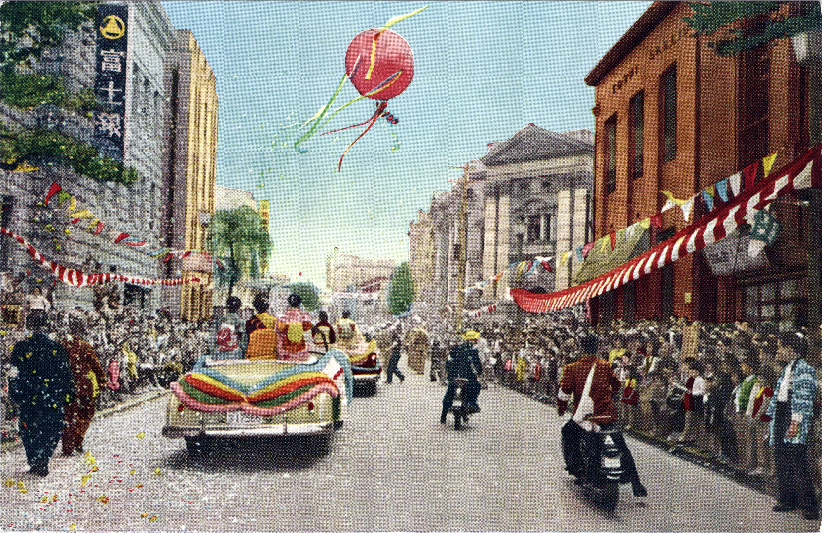 Yokohama port centennial parade, 1958, down Basamichi-dori – technically, one year early. (The Port of Yokohama was opened for trade in 1859.) The granite-colored building right-of-center is the present-day Kanagawa Prefectural Historical Museum (before its original copper dome, destroyed in the 1923 Great Kanto earthquake and left unrepaired, was replaced in 1967), the former headquarters of the Yokohama Specie Bank; at left is the former Yokohama branch of Fuji Bank, the present-day location of the Graduate School of Film and New Media.