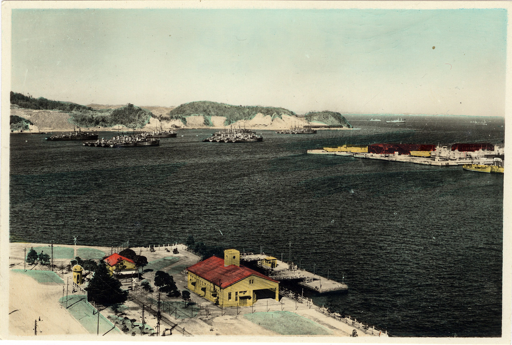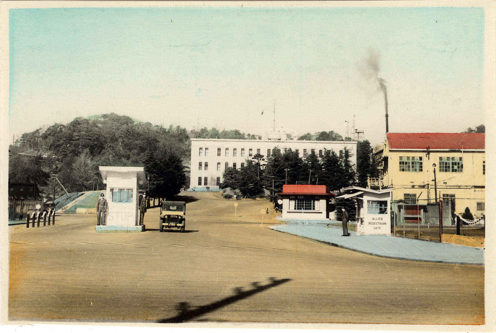 Main gate entrance, Yokosuka Naval Base, c. 1949. It was not until the beginning of the Korean War in 1950 that the former Imperial Japanese Navy base began its transformation into a strategic base for the U.S. 7th Fleet. Before then, during the early Occupation era, Yokosuka was an almost-sleepy backwater port for the U.S. Navy, serving primarily as a Marine Barracks, a naval hospital, and a ship repair & maintenance facility for the U.S. fleet in the Pacific.