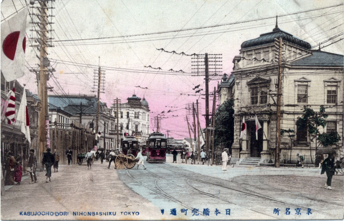 - Streetcars rolling down Chuo-dori in the financial Kabutocho district of Nihonbashi, c. 1910.