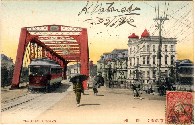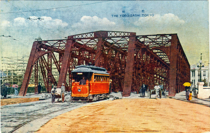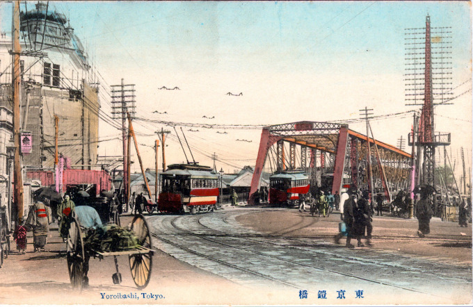 Modernization, after the Restoration, brought to Japan new bridge-building materials and technologies. Among the first Meiji era bridges to be built in a Western style in the renamed capital, Tokyo, was Yoroibashi [armor bridge], erected of iron in 1872 across the Nihonbashi canal that replaced a feudal era ferry crossing at Kabutocho. Yoroibashi would be refurbished and widened around 1920 to better accommodate electric streetcar and pedestrian traffic.