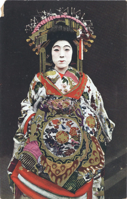 “The tying of an obi in front of the waist instead of behind is a sign that a woman belongs to the ‘oldest profession in the world,’ but such a sight is seldom seen outside the limits of the Yoshiwara, or on the stage, where the heroines of the popular drama, as I have already mentioned, are mostly low women.