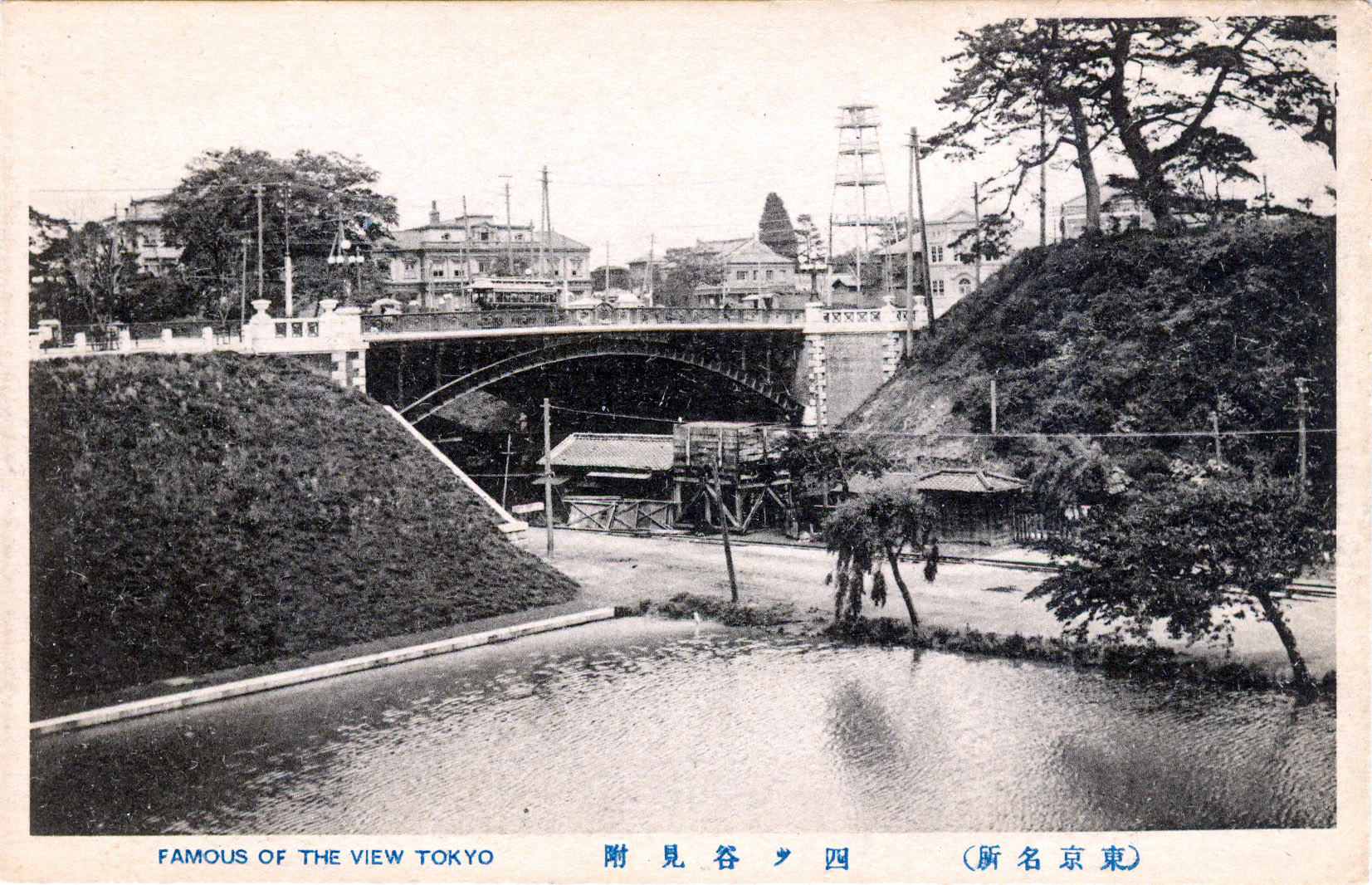 “In 1911, the city of Tokyo began construction of a bridge at the outer moat to allow the highway to continue straight ahead. This is Yotsuya-mitsuke Bashi (Yotsuya-mitsuke Bridge) and it was completed in September 1913, with a French-style classic type design so as to be in harmony with the neighboring scenery.”