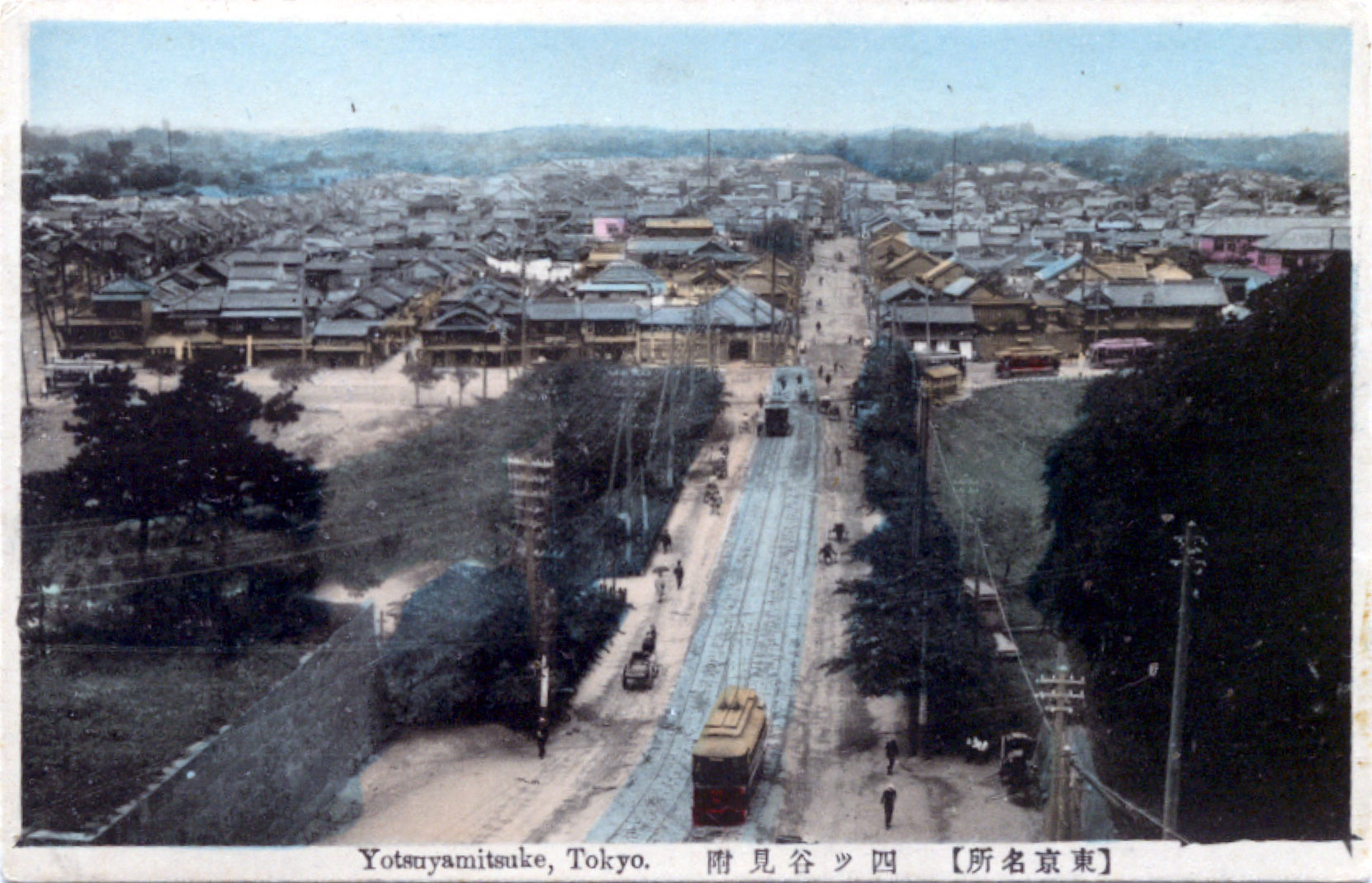 Looking across Yotsuya-mitsuke Bridge toward the northwest, c. 1915, with Yotsuya Station of the Chuo Line beneath.