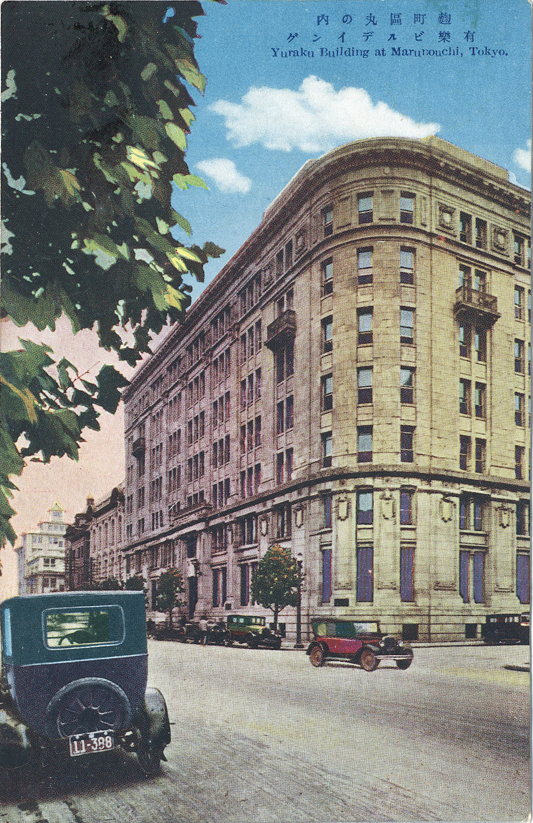 Yuraku Building, Marunouchi, Tokyo, c. 1930. One of the dozens of rather nondescript office buildings in the Marunouchi business district that survived the Tokyo firebombings intact which, after Japan’s surrender, were turned into makeshift dormitories for the tens of thousands of Occupation administrative personnel. The Yuraku biru appears to be just down the street from the Mainichi shimbun offices and printing plant (white building in the distance, far left).